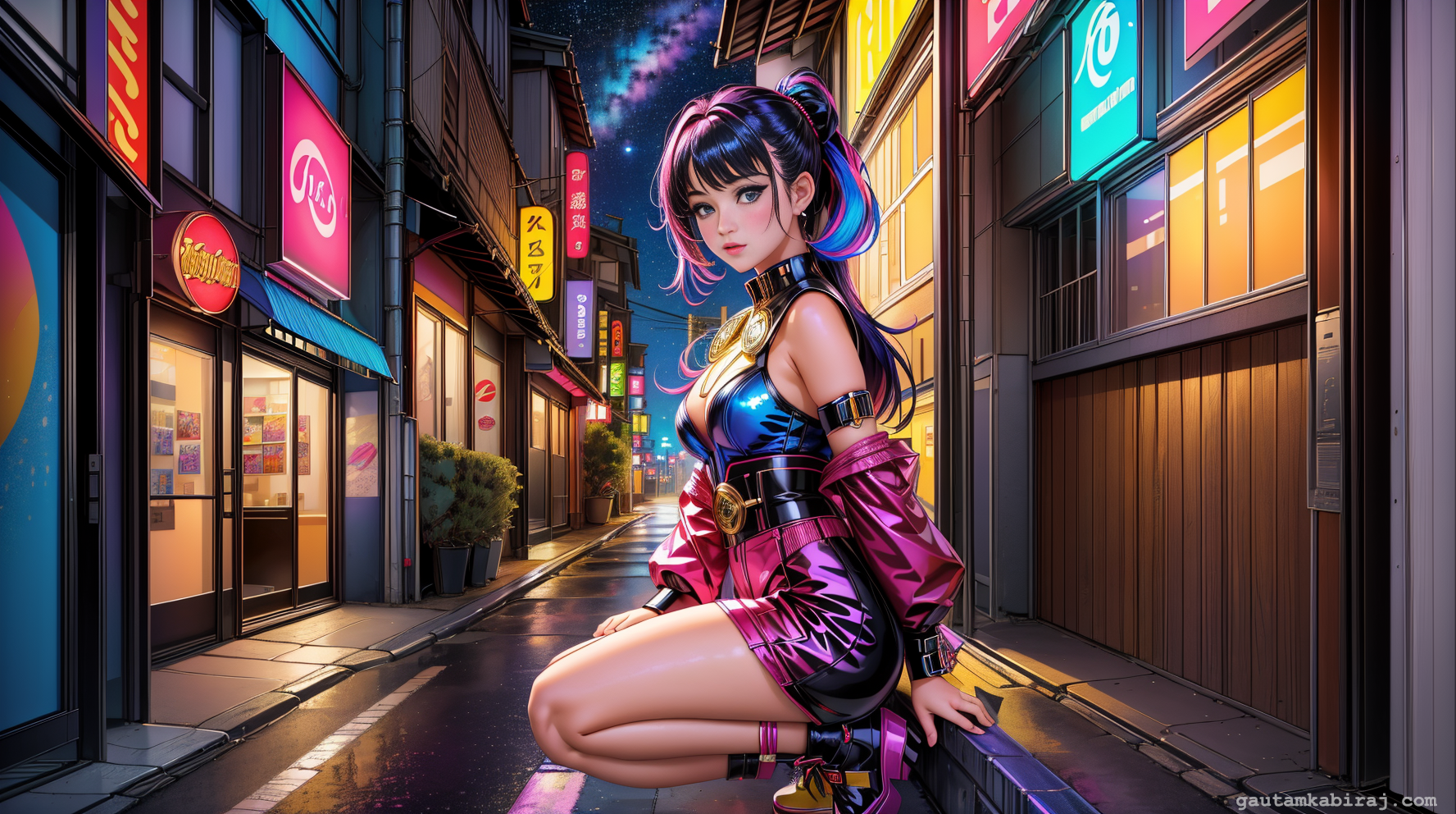 Girl Squatting In Tokyo (Cyberpunk Style)